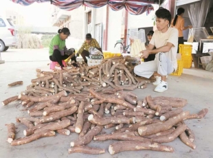 2024-11-28村民在分拣打包木薯。 11月19日,灵山县檀圩镇桥梓村电商基地内人头攒动,工人们正根据客户订单,有条不紊地对木薯进行削皮、分拣、打包、装箱等一系列操作,现场一派繁忙景象。 近年来,得益于...