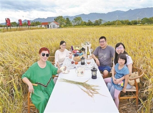 2024-10-08市民游客在新圩田园丰收打卡点拍照。(本组图/记者 黄晓珍 摄) 在金灿灿的稻田里吃一顿“乡宴”,以戏剧的形式演绎“一粒种子到一粒米”……这个国庆假期,厦门各美丽休闲乡村风景如画,市民游客不妨...
