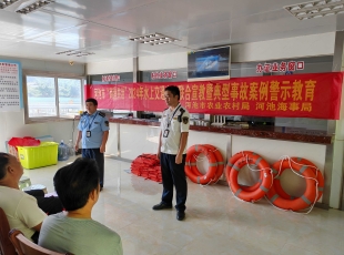 2024-07-297月25日上午10时,河池市农业农村局、河池海事局在天峨县龙滩库区开展“商渔共治”三年攻坚行动2024年联合巡航暨应急演练活动。 活动开始,首先组织渔民代表在渔政趸船观看警示教育片,开展安全教育...