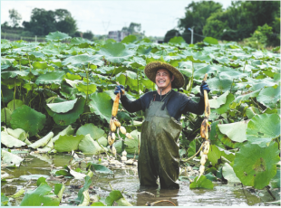 邕宁区蒲庙镇新生村的莲藕种植户开心地展示丰收的莲藕。(玉琪 摄) 近日,在邕宁区蒲庙镇新生村,藕农穿着一身防水衣在藕田中娴熟地刨“金”。他们俯身在淤泥中摸索,用高压水枪冲刷莲...