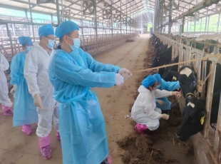 2024-05-135月8日,河池市动物疫病预防控制中心到罗城仫佬族自治县广隆牧业有限公司(奶牛场)开展布鲁氏菌病、牛结核病等2项人畜共患病监测工作。 当天,工作人员身穿防护服,逐一对牛只进行采样,共采集血...