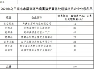 2021-11-15根据自治区农牧厅《2014年自治区屠宰环节病害猪无害化资金补贴方案》(内农牧医发〔2014〕302号),经企业申报,旗县农牧主管部门、财政主管部门审核汇总上报,乌兰察布市农牧局对旗县上报的...