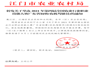 2021-09-17附件:0831关于举办2021年第四届全国农业行业职业技能大赛广东省初赛(农机驾驶员)的通知.pdf 原文链接:http://www.jiangmen.gov...