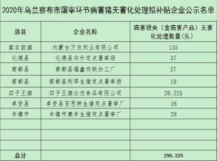 2021-09-16根据自治区农牧厅《2014年自治区屠宰环节病害猪无害化资金补贴方案》(内农牧医发〔2014〕302号),经企业申报,旗县农牧主管部门、财政主管部门审核汇总上报,乌兰察布市农牧局对旗县上报的...