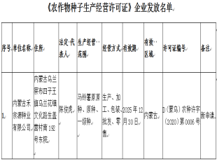 根据《中华人民共和国种子法》、《植物新品种保护条例》、《农作物种子生产经营许可管理办法》(农业部令2016年第5号)和《内蒙古自治区农作物种子条例》规定,经审核,批准核发内蒙古禾宗源种业有...