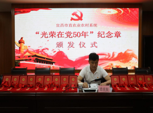2021-09-17近日,根据中央、省、市统一安排部署,宜昌市农业农村局机关离退休干部党支部举行了“光荣在党50年”纪念章颁发仪式,局党组成员、工会主任覃虎挺出席颁发仪式,14名局机关离退休老党员参加仪式,局直属...