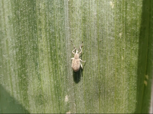 2024-07-01一、成虫识别 双斑萤叶甲也叫长跗萤叶甲,属鞘翅目叶甲科,是为害玉米的一种新型害虫。成虫体长3.6~4.8mm、宽2~2.5mm,触角11节丝状,端部色黑,长为体长的2/3;复眼大,呈卵圆形;前胸...