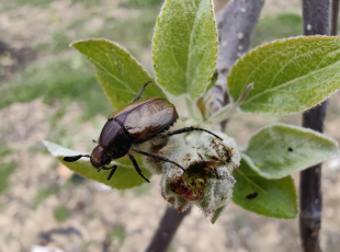 2024-04-08据调查,近期黄陵县部分玉米地金龟子数量很大,呈区域性重发,给临近果园金龟子防治增加了难度,以苹毛丽金龟甲为主。 苹毛丽金龟甲,体卵圆形,长10mm左右。头胸背面紫铜色,并有刻点。鞘翅为茶褐色,具...
