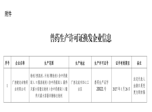 2024-08-12根据《兽药管理条例》规定,经审核,广西健龙动物药业有限公司符合兽药生产许可变更条件,现予换发兽药生产许可证。 附件:兽药生产许可证换发企业信息 广西壮族自治区农业农村厅 2024...