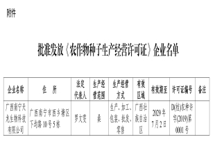 2024-08-12依据《中华人民共和国种子法》《农作物种子生产经营许可管理办法》等有关规定,批准发放广西南宁天龙生物科技有限公司《农作物种子生产经营许可证》(详见附件),现予公告。 附件:批准发放《农作物...