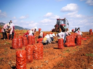 2024-12-16初冬时节,曲靖市富源县15万亩魔芋进入采收期,田间地头随处可见农户忙碌的身影,采收机在地里来回穿梭,工人们忙着分拣、装袋,阳光下装满了魔芋的红袋子成为冬日里最靓丽的风景。 农户拣装魔芋。...