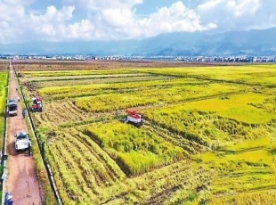 金秋十月稻花香,千亩水稻收割忙。眼下,保山市隆阳区河图街道千亩水稻进入收割期,收割机在金黄的稻田里来回穿梭,切割、脱粒、粉碎稻秆等工序一气呵成,一派忙碌的丰收景象。(记者:杨艳鹏 通讯员:莽红...