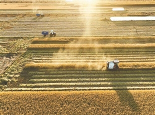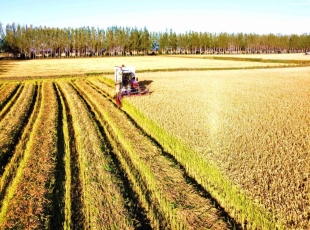 2025-10-09刘宪武摄 金秋十月,稻浪翻涌,绥化市北林区的稻田进入全面收割季。在北林区秦家镇国家级水田示范区,联合收割机在金色稻田中穿梭作业,拖拉机紧随其后运载稻粒,机械化作业场面蔚为壮观,一派繁...
