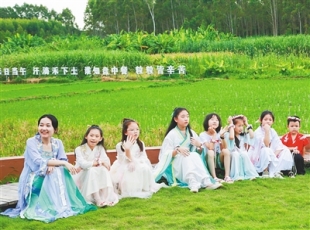2024-08-12临高黎安村办起耕读山房,为乡村振兴变观念、谋福利、促发展 在临高县东英镇黎安村,耕读山房举行暑期夏令营活动,图为活动成员在稻田里畅谈耕读体会。(资料图) 海南日报全媒体记者 贾...