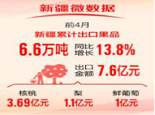 乌鲁木齐6月5日讯 石榴云/新疆日报记者曹华从自治区林业和草原局获悉:前4月,新疆果品出口快速增长,累计出口果品6.6万吨,同比增长13.8%,出口金额7.6亿元。 据了解,前...