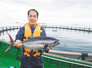 2024-06-12发力水产南繁、投入深远海养殖、打造休闲渔业 陵水黄鳍金枪鱼海上养殖示范基地,工作人员展示黄鳍金枪鱼。 记者 袁琛 摄 俯瞰陵水新村镇疍家渔排。记者 王程龙 摄 陵水黄鳍金...