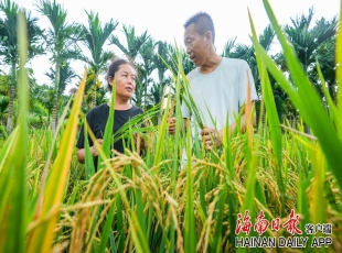 2024-06-12海南日报记者陈元才 摄影报道 村民王海妹(左)和海南省农科院技术人员查看香稻新品种“久久香1号”生长情况。 2024年6月7日,在五指山市毛阳镇毛兴村什拥田洋,村民王海妹和海南省农科院...